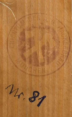 Na listwie górnej, obok stempla tuszem: Nr. 81. Ponadto na płótnie zatarty stempel: /..../ Hackerbräu
