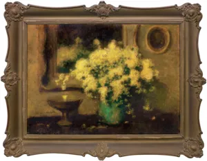 U dołu nalepka (maszynopis): Ze zbioru Inż. T. Litawińskiego | Alfons Karpiński 1875 - | „Mimoza“ | olej. tekt. rozm. 50 x 70 cm | sygn. Na nalepce stempel jak powyżej: No 29.
