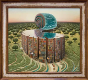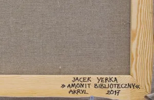 sygn. na odwr. na dolnej belce krosna: JACEK YERKA | >>AMONIT BIBLIOTECZNY<< | AKRYL 2017
