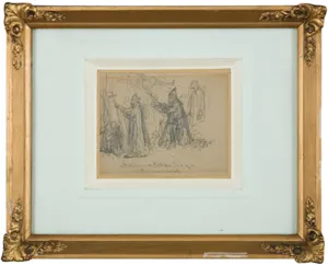 Szkic nieznanej (niezrealizowanej?) kompozycji. Rysunek można hipotetycznie łączyć jedynie z, wzmiankowanym przez Mariana Gorzkowskiego, pomysłem dotyczącym dekoracji wnętrz krakowskiego „magistratu“ (Pałacu Wielopolskich). Otóż - jak pisze Gorzkowski - dr [Józef] Dietl, prezydent miasta Krakowa, umysł ruchliwy i czynny, zamierzał ozdobić salę magistratu ściennymi malowidłami. Zaprosiwszy Matejkę, prowadził z nim w tym kierunku narady. Matejko przedstawił mu swoje pomysły: by ściany w sali radnej zapełnić malowaniem obrazów na tle ujemnych, a potem dodatnich wypadków dotyczących miasta Krakowa; rozpocząwszy więc zabójstwem św. Stanisława na Skałce, dopełnić apostolstwem św. Wojciecha, potem różnymi scenami /./ Projekt ten nie przyszedł jednak do skutku...