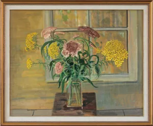 Na odwrocie szkic czarną kredką lub ołówkiem: martwa natura z kwiatami w wazonie.