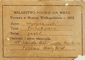 Na odwrocie nalepka wystawowa o treści (druk wypełniony ręcznie atramentem): MALARSTWO POLSKIE XIX WIEKU | Wystawa w Muzeum Wielkopolskiem r.1932 | Autor: Wyspiański | Tytuł: Portret pana | Techn. pastel | Nazwisko i adres właściciela | WP. Wanda Chełmońska-Boczkowska | Poznań, Matejki 68.