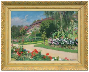 Obraz przedstawia widok na dom i ogród Jadwigi i Józefa Mehofferów w Jankówce pod Krakowem. Jak wspomina Antoni Waśkowski, artysta kupił ten stary drewniany dworek w roku 1908 - Od dworku spadał łagodnie ku południowi duży ogród - znamy go z obrazów Mehoffera - pełen kwiatów, a w dole był sad. Przy ścianie dworku - przyzba... Artysta urządził i zaprojektował zarówno wnętrza dworu, jak i otaczający go wspaniały ogród, urzekający rozmaitością zmie...