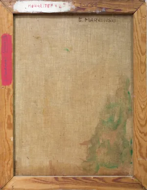 Na odwrocie na płótnie sygnatura: E. MARKOWSKI; na krośnie napisy: l.: E. Markowski – WARSZAWA [w ramce]; g.: „MORALITET x 2 70 x 55