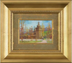 Obraz przedstawia siedemnastowieczną greckokatolicką, cerkiew p.w. św. Jakuba w Powroźniku (między Krynicą a Muszyną). W 2013 roku ta zabytkową łemkowska cerkiew została wpisana na Listę Światowego Dziedzictwa UNESCO.