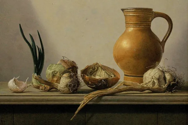 na odwr. flamastrem: 2016 [w ramce] MACIEJ CICHOCKI | ‘DZBANEK, CZOSNEK I CEBULE” | 35 x 50 cm | OIL / MASONITE
