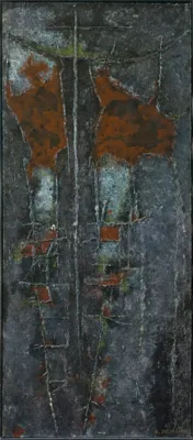 Obraz namalowany w 1961 roku wpisuje się w cykl pionowych Pejzaży artysty, który zmienił wówczas swój malarski sposób emocjonalnego przekazu. Nowe płótna charakteryzuje ciemna kolorystyka, pełna niuansów barwnych, balansująca między zielenią, brązem czy zgaszonym błękitem. Nasycon...