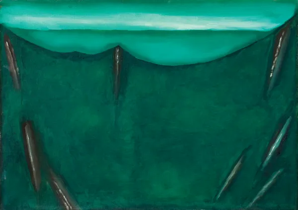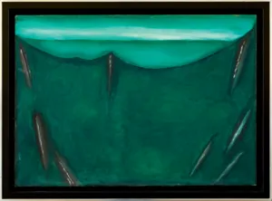 Niemniej i w tym temacie zachował artysta myślenie „ikoniczne“ posługując się prostymi znakami, buduje przestrzeń malarską w wypracowany sposób, stosując intensywny kolor, rozbiela go i niuansuje. Te pejzaże Nowosielskiego, a wśród nich przedstawiony do zakupu obraz, swoją prostotą przekazu i swoistą magią przemawiają silnie do widza.