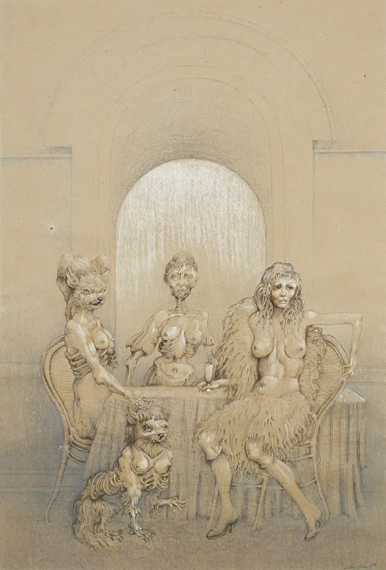 gwasz, tusz, pastel, ołówek, papier beżowy