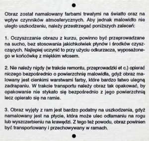 Na odwr. na płycie naklejona nalepka opisująca zasady konserwacji i przechowywania obrazu.
