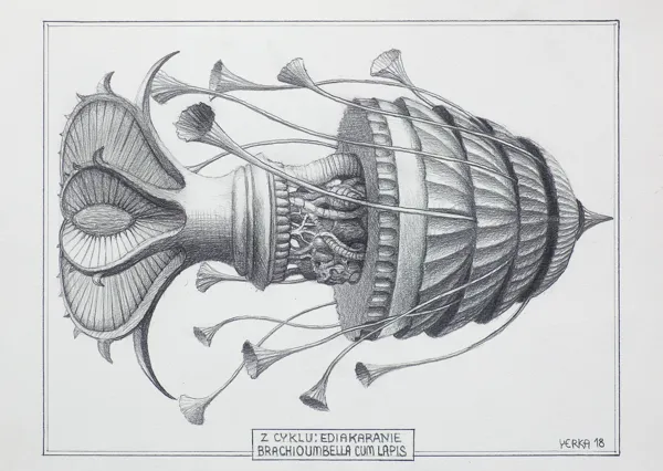 sygn. p.d.: Yerka 18, śr w ramce tytuł: Z CYKLU : EDIAKARANIE | BRACHIOUMBELLA CUM LAPIS