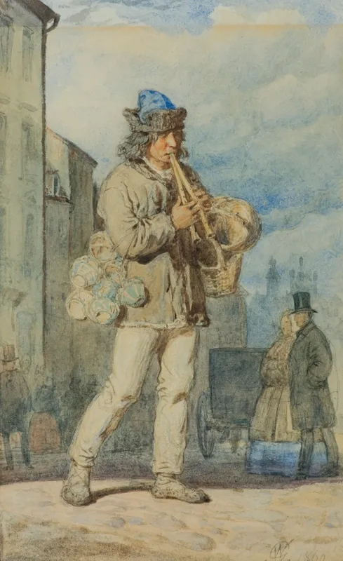 Przedstawiona akwarelka pomyślana jest jako kompozycja tak rodzajowa, jak i etnograficzna – wędrowny garncarz w wiejskim odzieniu, idący miejską ulicą, zwraca uwagę na siebie i swój towar grając na – popularnej dawniej na Podhalu – piszczałce dwoistej zwanej też dwojacką.