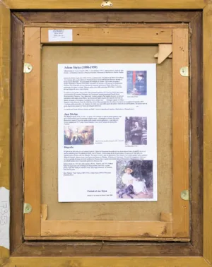 Na odwrocie karta z notą dot. Adama i Jana Styki (tekst włoski; wydruk komputerowy). Etykieta domu aukcyjnego – Gonnelli Casa d’Aste we Florencji (Via Ricasoli, 6-14/r).