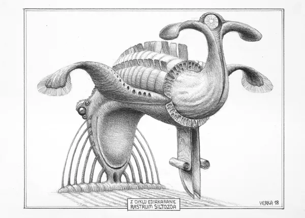 sygn. oł. śr.d.: Z CYKLU EDIAKARANIE | RASTRUM SILTOZOA [w ramce], p.d.: YERKA 18