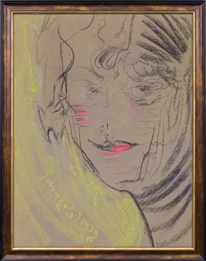 Zgodnie z adnotacją przy sygnaturze portret ten zakwalifikował artysta do kategorii C, a malował go pod wpływem kokainy (skrót „Co“). Według Regulaminu Firmy Portretowej, portrety tego typu zakładały „subiektywną charakterystykę modela“ oraz „spotęgowania tak formalne, jak i psychologiczne“. Rzeczywiście – twarz modelki została przekształcona, choć jej rysy pozostały rozpoznawalne – niebieskie oczy, czerwone usta oraz krótka fryzura z przedziałkiem pośrodku znane są z innych jej portretów i fotografii. Szkicowe wykonanie i ciekawa kompozycja – przedstawienie samej głowy w tzw. ciasnym kadrze, tj. bez jej górnej części oraz lewej strony, podnosi ekspresję wizerunku i stwarza wrażenie, jakby modelka spoglądała na widza zza okiennej ramy. Lekki wyraz dezaprobaty malujący się na jej twarzy sugeruje, że jest niezbyt zadowolona z tego, co właśnie widzi. Być może – nie podobał się jej stan artysty po zażyciu narkotyku i nie chciała być portretowana w tej sytuacji?
