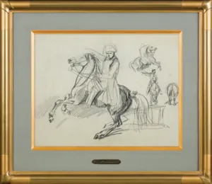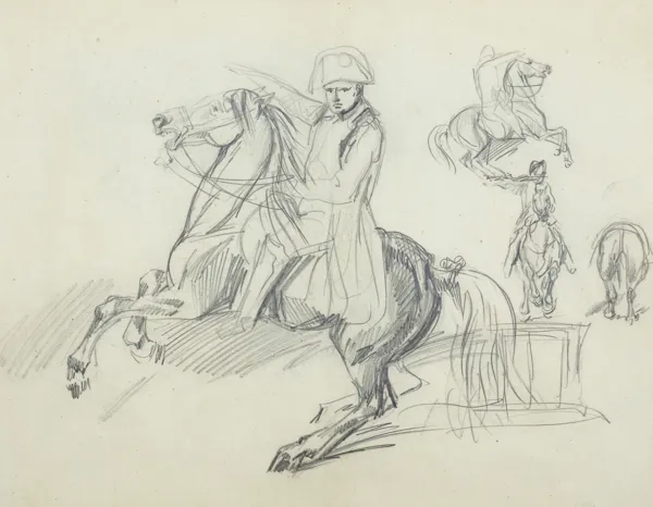 Ten dwustronny rysunek – przedstawiający różne ujęcia jadącego konno Napoleona, jak również samego konia bez jeźdźca – wiąże się z rzeźbioną stat...