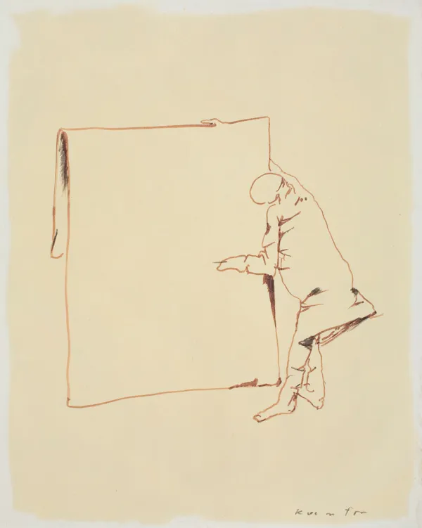 Do rysunku dołączona jest informacja, że został zakupiony od Stanisława Balewicza, dyrektora Galerii Krzysztofory w latach 1957-1987. Być może przedstawia samego Balewicza w charakterystycznym geście galerzysty, który odsłania/rozpakowuje obraz. Praca powstała w związku z jubileuszem Krzysztoforów w 1987 roku.