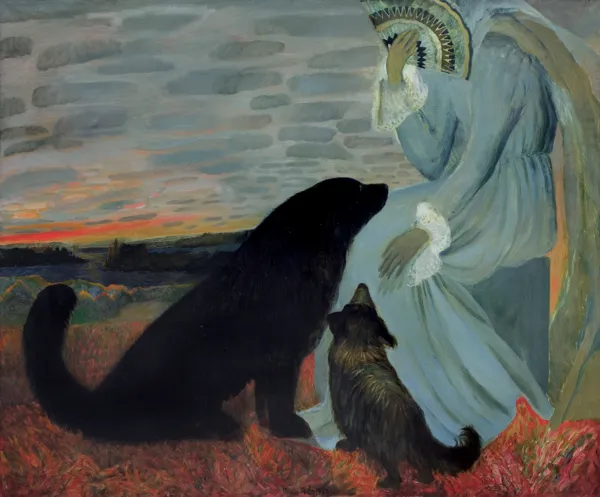 Duża pośmiertna wystawa Marii Anto odbyła się w Zachęcie dwa lata po śmierci Artystki. Towarzyszyło jej obszerne wydawnictwo z reprodukcjami prac, w których odnajdujemy motywy i formy z przedstawionego do sprzedaży obrazu. W połowie lat 70-tych powstał cykl obrazów z wachlarzem, który to rekwizyt pozornie mało eksponowany, kreuje nastroje kompozycji wprowadzając niepokój i tajemniczość. I chociaż uwagę widza przyciągają psy, usytuowane centralnie i będące bohaterami sceny, to postać w błękitnej sukni kryjąca twarz za wachlarzem tworzy surrealną atmosferę tego dzieła.