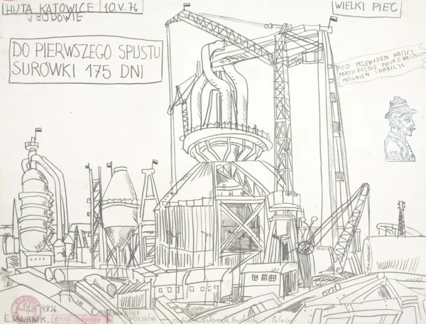 Huta Katowice 10 V 76 w budowie. Do pierwszego spustu surówki 175 dni, z cyklu Plenery, 1976