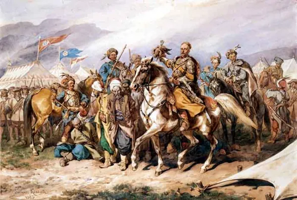 Obraz z roku 1883, o pełnym tytule:ROMAN RUSZCZYC WRACA Z PODJAZDU Z JEŃCAMI DO OBOZU POLSKIEGO POD TULLNEM Sygnowany l.d.: Juliusz Kossak | 1883