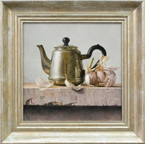 sygn. na odwr. płyty: 2018 [w ramce] | MACIEJ CICHOCKI | „IMBRYK” – OIL/MASONITE | 30 x 30 cm