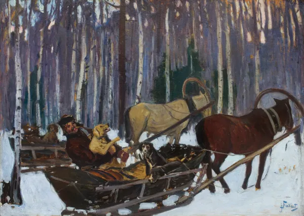 Jak można wnioskować z opisanych nalepek, w okresie międzywojennym obraz był – przynajmniej dwukrotnie – pokazywany w warszawskim Towarzystwie Zachęty Sztuk Pięknych: po raz pierwszy na niezidentyfikowanej wystawie oraz w roku 1937 na wystawie „łowieckiej“. Był wówczas własnością Jana Olszewskiego (1873-1943), malarza, ilustratora, pisarza, pedagoga i kolekcjonera. Nota w katalogu wystawy łowieckiej odpowiada zapisowi na – wyżej cytowanej – nalepce.