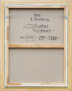 na odwr. na płótnie sygnatura: 2008 | E. DWURNIK | „CZERWONE | TULIPANY = | NR: XXIII [w ramce] – 239 = 3880 =