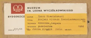 Na odwrocie nalepka pośmiertnej wystawy prac Tymona Niesiołowskiego w Muzeum im. Leona Wyczółkowskiego w Bydgoszczy w 1966 roku z opisem obrazu.
