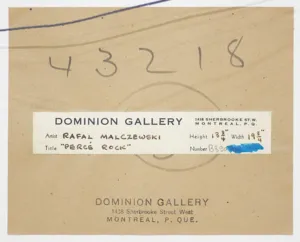na odwr. naklejony fragment starych papierowych „pleców“ ze stemplem i nalepką Dominion Gallery w Montrealu z danymi obrazu, powyżej napis: [.]3218