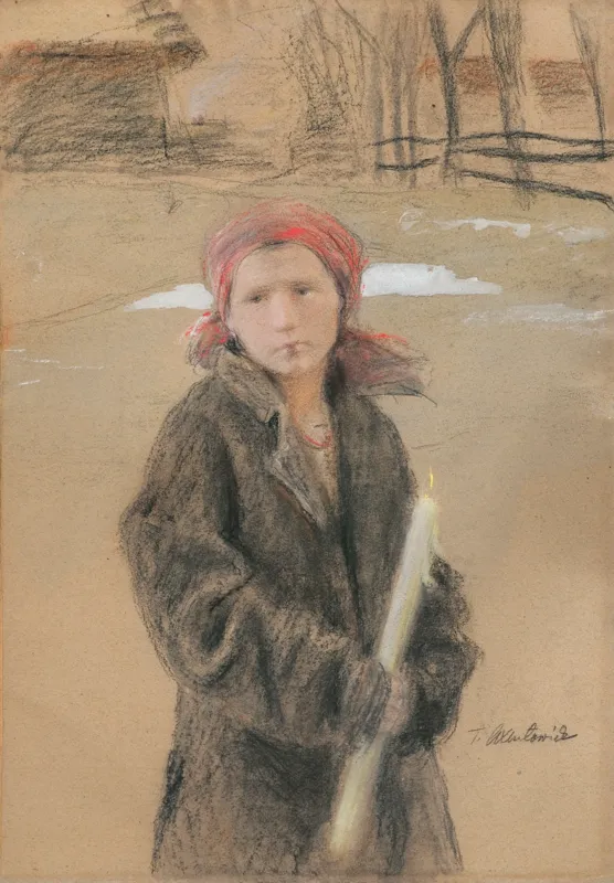 Teodor Axentowicz był jednym z pierwszych polskich artystów malujących, tak później popularne, obrazy z życia Hucułów. Motywy huculskie powtarzał w wielu wariantach i układach kompozycyjnych, malowanych olejno, akwarelą bądź pastelami. Wśród nich powracały także przedstawienia huculskiej dziewczyny z gromnicą, obrazy nawiązujące do obchodów święta Matki Boskiej Gromnicznej, obchodzonego w kościele wschodnim w dniu 15 lutego. Poświęcona w cerkwi gromnica, miała przynieść pomyślność i chronić przed urokami. Tę samą modelkę w analogicznej pozie, lecz na innym tle pejzażowym przedstawił artysta także w olejnym obrazie ze zbiorów Muzeum Narodowego w Warszawie.