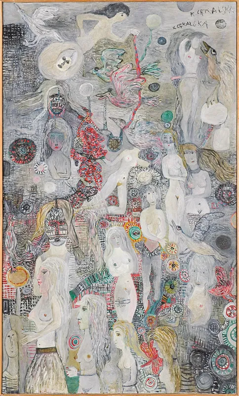 sygn. p.g. : K CĘKALSKA | K CĘKALSKA, na odwr. na pł. g.: KRYSTYNA CĘKALSKA | 100 x 60 | "KOBIETY", na blejtramie l.g. nalepka Triennale Malarstwa Realistycznego w Sofii (rubryki w jęz. Franc., wypełnione ręcznie w jęz. bułgarskim)