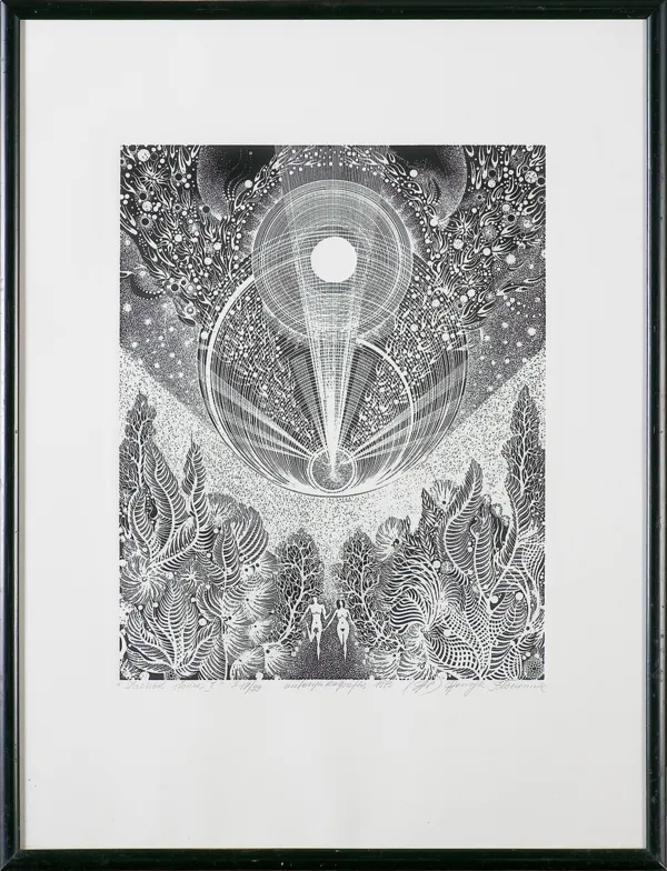 sygn. oł. pod ryc.: „Zachód Słońca I.” II 18/99. autocynkografia 1975. (AP.) Henryk Płóciennik