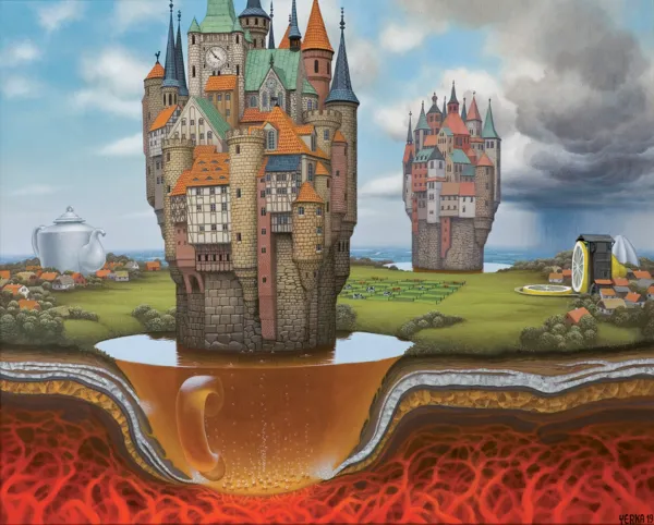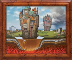 sygn. na odwr. na d. żerdzi krosna: JACEK YERKA >>HERBATKA NA ZAMKU<< | AKRYL 2019