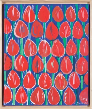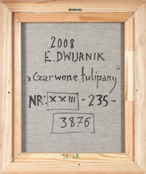 sygn. na odwr. na płótnie: 2008 | E. DWURNIK | „Czerwone tulipany“ | NR: XXIII [w ramce] – 235 – 3876 [w ramce]