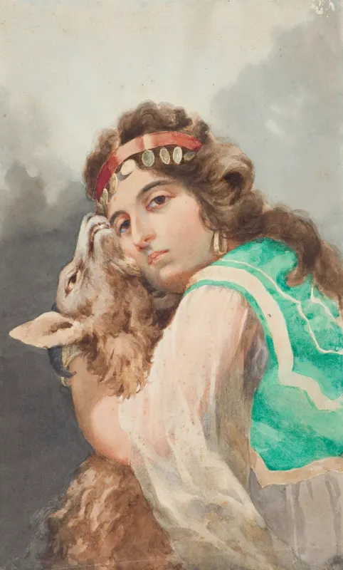 Esmeralda – piękna Cyganka, bohaterka powieści Victora Hugo „Katedra Najświętszej Marii Panny w Paryżu” (wydanej w 1831 r.). W swojej akwareli Alchmowicz przedstawił ją z ulubioną kózką.