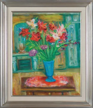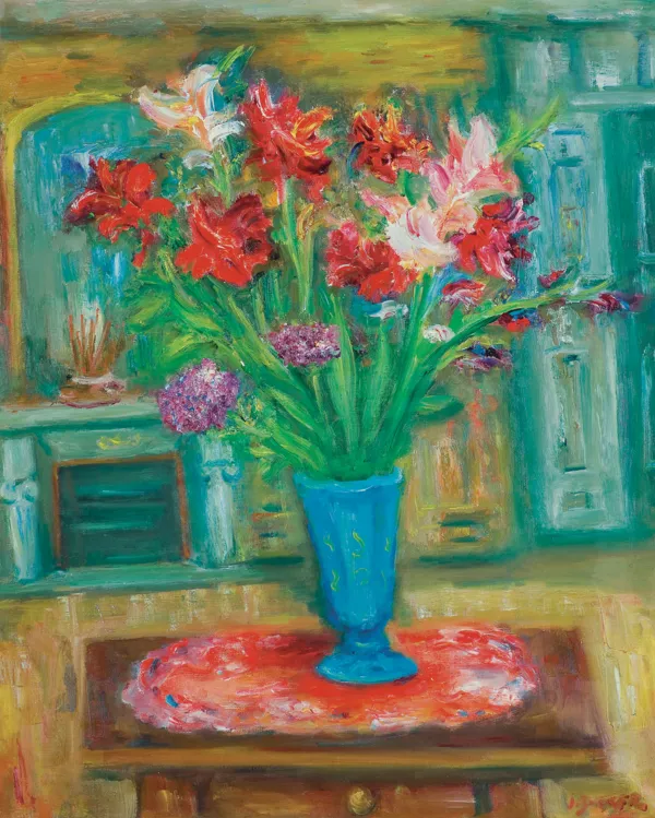 na odwrocie na górnej listwie krosna nalepka: Flowers in Blue Vase | Oil | By Jacques Zucker