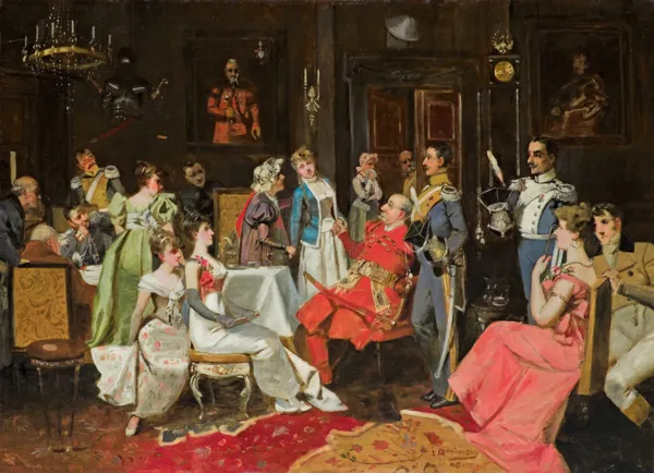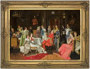 na odwrocie na górnej listwie krosna nalepka Salonu Juliana Burofa (druk, pieczęć, tusz): MAGAZYN ARTYSTYCZNY I SALON OB[...] | JULIANA BUROFA, Warszawa, Nowy Świat 47. | No 1544 Autor Jan Moniuszko | Tytuł Zaręczyny Rodzaj dzieła olej | Cena [...] Własność [...] | data 18 [...] rok