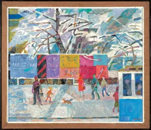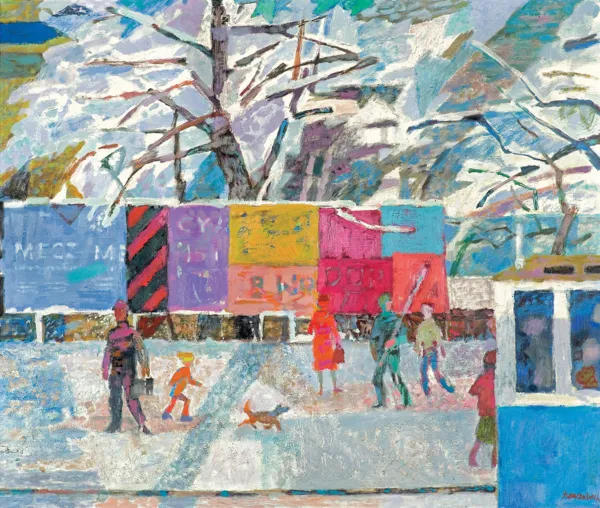 – na odwrocie na płótnie pośrodku autorski napis: JAN SZANCENBACH | PEJZAŻ ZIMOWY Z PLAKATAMI | ACRYL + OLEJ | 1976;