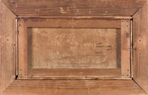– na prawej listwie krosna wyciśnięty znak składu przyborów malarskich francuskiej firmy „Lefranc et Cie“ [kotwica skrzyżowana z kaduceuszem pomiędzy literami L F]; ponadto napis ołówkiem: R | 21