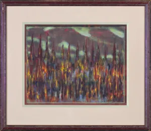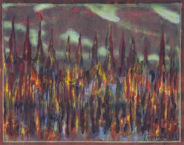 sygn. p.d.: J. Tchórzewski 81., niżej druga sygnatura częściowo zamalowana i zasłonięta przez domalowaną ramkę: JTchórzewski 81 r, na odwr. oprawy sygn. flamastrem: J. Tchórzewski 81 | „SŁOŃCE ZACHODZI” | akryl – tempera