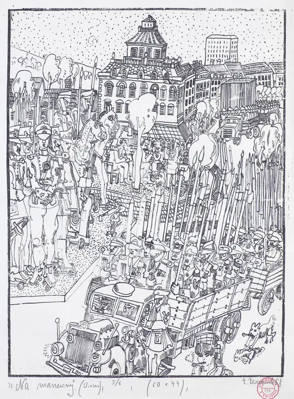 sygn. oł. pod ryc. l.: »Na manewry” (Wiosna), 5/6, (60 x 44),; p.: E. Dwurnik 68.; na sygn. nałożona czerwona okrągła pieczęć z napisem w otoku: LITOGRAFIA | E. DWURNIK i nr oł. w śr.: 773.
