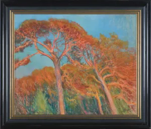 Zafascynowany krajobrazem, przyrodą i światłem malował pejzaże nadmorskie i wysokie, oświetlone mocnym słońcem sosny rosnące na piaszczystych brzegach. Motyw ten wyraźnie urzekł art...