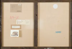- poniżej do kartki przyklejona nalepka (druk): JAMES BOURLET & SONS Ltd., | Fine Art Packers Fram Makers | P 65[...] | 17 & 18 NASSAU STREET, | MORTIMER STREET. W. | Phones: MUSEUM 1871 & 7588