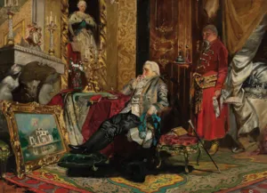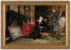 W zbiorach Muzeum Narodowego w Warszawie znajduje się nieznacznie większa kompozycja, przedstawiająca tę samą scenę z królem Stanisławem Augustem, który na wygnaniu w Petersburgu z rozrzewnieniem wpatruje się w obraz przed...