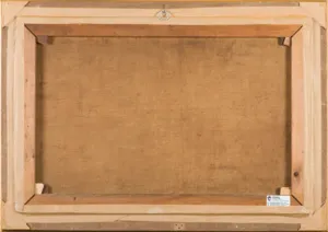 na odwrocie, na płótnie, centralnie umieszczona, nieczytelna, owalna pieczęć składu przyborów malarskich.