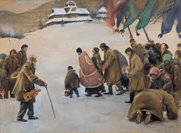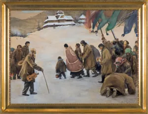 Teodor Axentowicz był jednym z pierwszych polskich artystów malujących obrazy z życia Hucułów. Jedną z najwcześniejszych, „huculskich“ kompozycji artysty było Święto Jordanu, motyw przedstawiony pierwotnie w dużych obrazach olejnych (lata 1893, 1895; zbiory MNP i MNW), a ze względu na swą popularność powtarzany i później w różnych replikach i wariantach, malowanych olejno, akw...