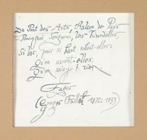 Wiersz, który stał się inspiracją literacką do powstania pracy, napisał francuski poeta Georges Faillet, pseud. Fagus. Fragment wiersza wchodzi w skład kompozycji – został zacytowany jako ciąg jasnoszarych liter w dwóch pasach przecinających pole obrazu, pionowo: – POURQUOI, SEIGNEUR, LES HIRONDELLES, SI BAS PUIS SI HAUT VOLENT-ELLES: QU’EN SAVENT ELL, poziomo: ES, QU’EN SAIS-JE? RIEN. ET MOI, POURQUOI GAI PUIS MOROSE, POURQUOI | MES VERS, POURQUOI MA PROSE. Ten sam, nieco skrócony cytat artysta umieścił również na odwrocie pracy, z nagłówkiem: Du Pont des Arts, Balcon de Paris, i podpisem: Fagus (Georges Faillet 1872-1933).