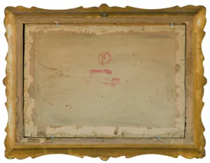 na odwrocie centralnie umieszczone dwie pieczęci Jerzego Kossaka, pierwsza okrągła pieczęć: JERZY KOSSAK | Kraków pl. Kossaka 4; w centralnej części pieczęci herb Kos | Nr _; druga pieczęć przybita poniżej, przeciwnie do kompozycji, jest nieczytelna