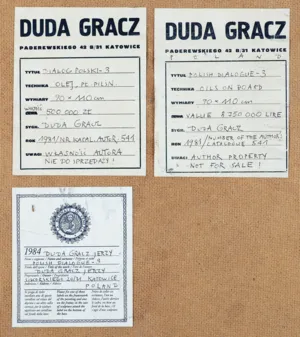 poniżej nalepka: LA BIENNALE . DI . VENEZIA | 1984 DUDA GRACZ JERZY | POLISH DIALOGUE - 3 | DUDA GRACZ JERZY | [adres] KATOWICE | POLAND;