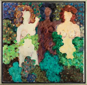 Prezentowany obraz ukazuje trzy kobiece akty zatopione w zieleni ogrodu i jest niezwykle rzadkim w dojrzałej twórczości Dominika przykładem malarstwa figuratywnego. W rozmowie ze Zbigniewem Taranienko tak artysta przedstawia zagadnienie obecności człowieka w swoim malarstwie: Wydaje mi się, że człowiek gdzieś w moim malarstwie jest. Myślę, że ci z Holendrów, którzy malowali pejzaż nie malując człowieka, tak samo malowali człowieka jak Rembrandt czy Brouwer. Malowanie otoczenia człowieka, to też pewne ukazywanie człowieka – nawet nie malując postaci, ujawnia się wtedy naszą, ludzką wiedzę o świecie. Obraz świata jest taki a nie inny, bo myśmy sobie taki świat stworzyli. I zawsze jest lustrzanym odbiciem człowieka – nie pokazującym go bezpośrednio, lecz poprzez jego widzenie świata.